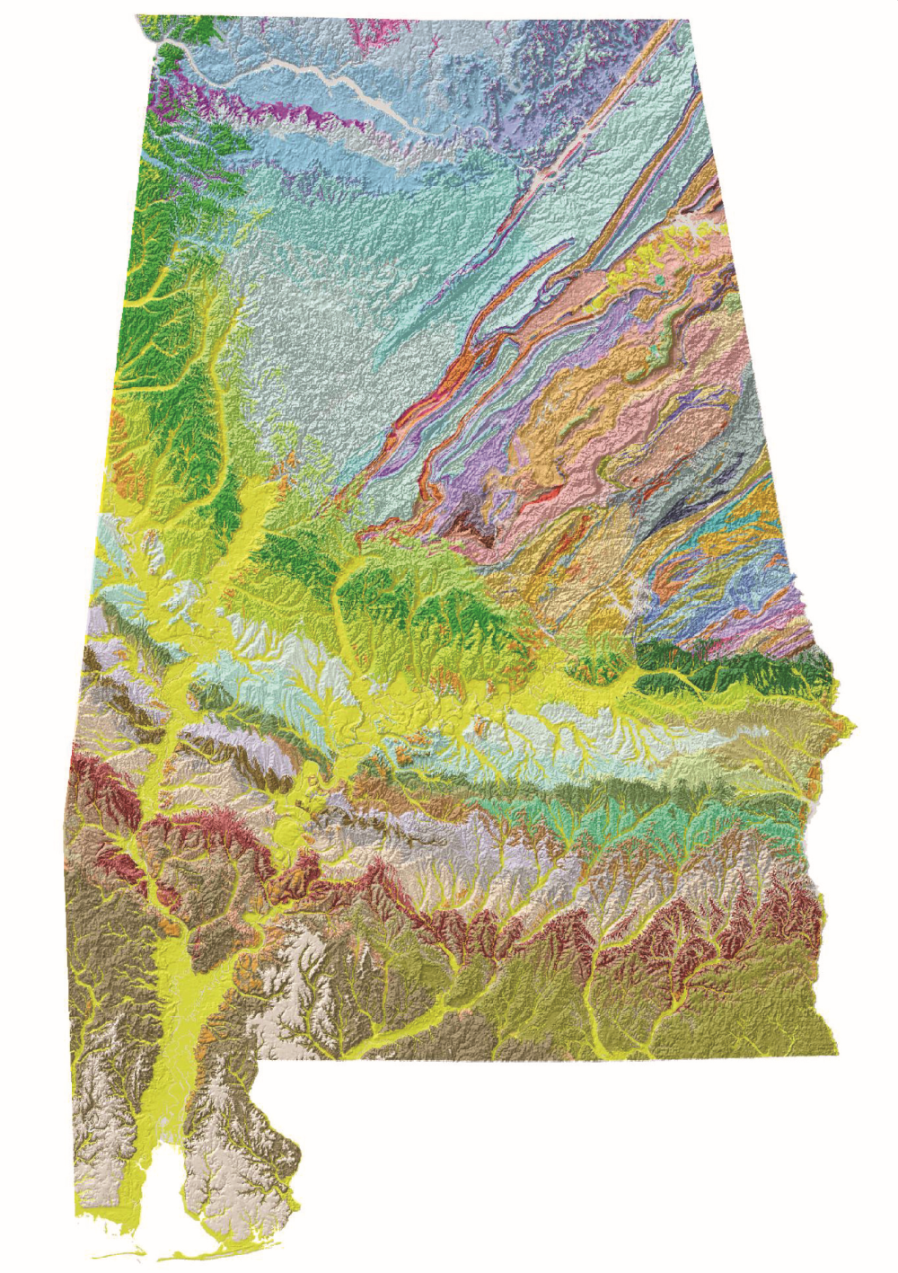 The colors on this map of Alabama represent the many geologic units in the state.