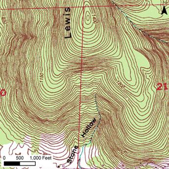In the example to the right, the scarp is the close East-to-West contours near the center of the image. The material of the slide is south of the scarp through Stone Hollow and the toe of the slide is at the end of the "e" of "Stone."
