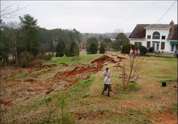 Photo of an active landslide in the backyard of a neighborhood in Union Springs, Bullock County, 2010. Scarp shown clearly in center of photo. The landslide’s scarp is in the Cusseta Sand Member of the Ripley Formation. Landslide topography can also be seen on the 1973 Union Springs 7.5-minute topographic map.
