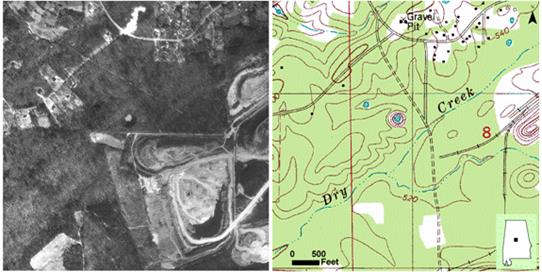 The "Golly Hole" in Shelby County as shown on aerial imagery (above-left), the 1:24,000 Alabaster topographic map (above-middle), and photo from the ground (photo by Tom Stone).