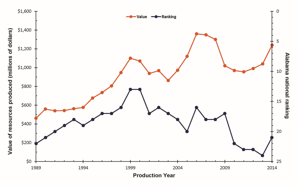 Since 1989, Alabama has seen a significant rise in the value of its industrial and construction minerals production (figure). Between 2008 and 2013, Alabama was the fourth- leading overall domestic producer of clay and shale, common clay, and kaolin, and the fourteenth-leading overall domestic producer of crushed stone and aggregate. Alabama has also remained a major producer of other industrial resources, including bauxite, cement, chalk, gemstones, dimension stone, iron oxide pigment, lime, marble, mica, salt, sand and gravel, and sulfur. In 2014, Alabama’s nonfuel industrial minerals production was valued at $1.24 billion